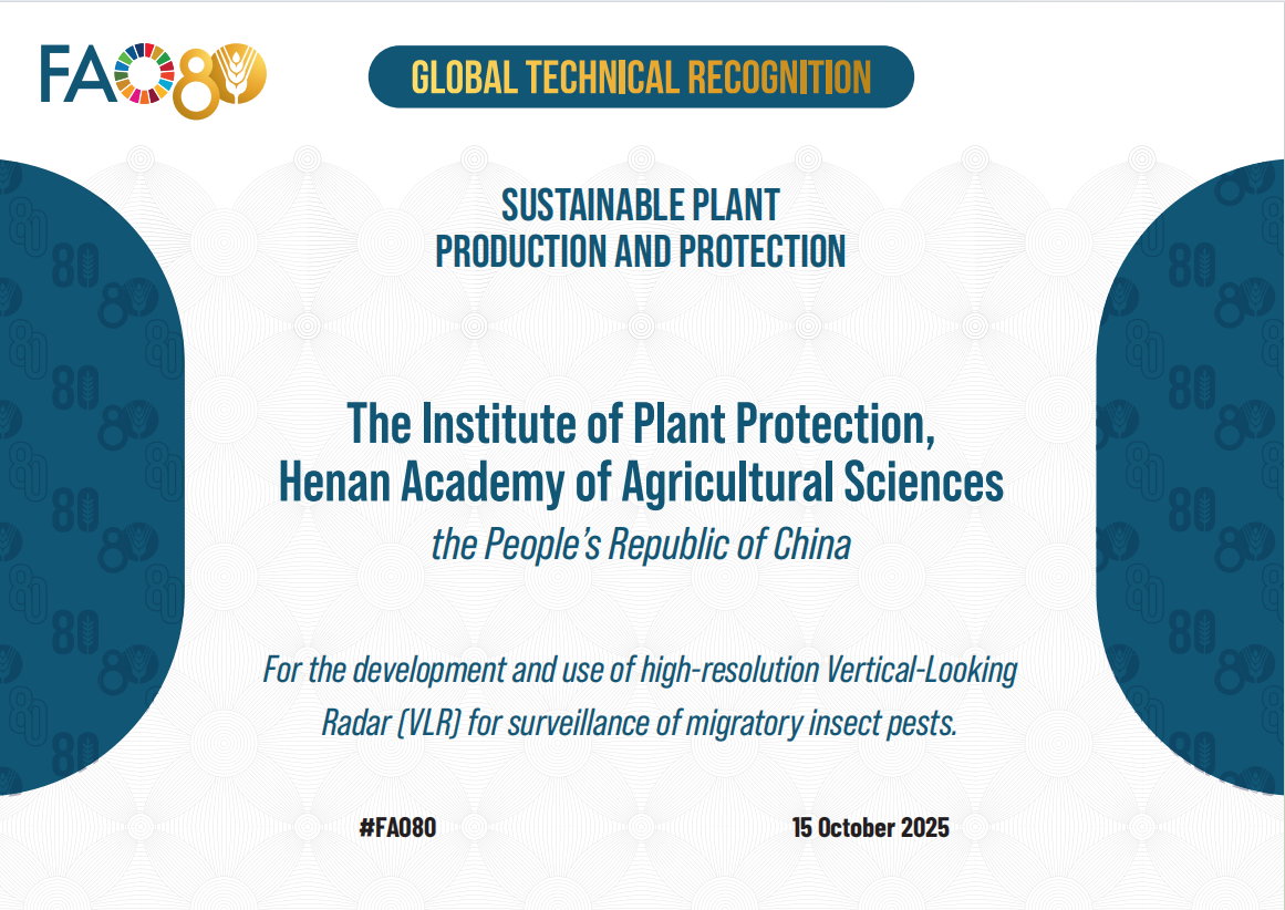2025年10月15日联合国粮农组织(FAO)首届全球技术卓越奖颁奖典礼在意大利罗马总部隆重举行,FAO总干事屈冬玉出席典礼并为线下参会的部分获奖单位代表颁发证书。我院植保所牵头完成的“用于迁飞害虫监测的高分辨率垂直监测雷达的研发与应用”荣获“可持续植物生产与保护”领域全球技术卓越奖。