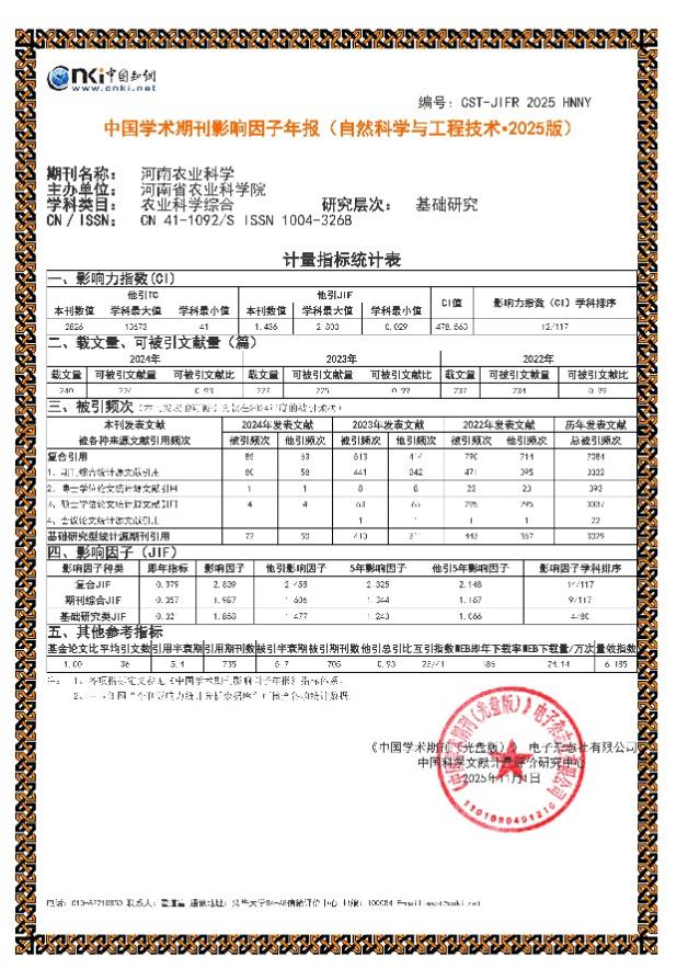 《河南农业科学》复合影响因子为2.839,较2024版(2.119)提高34.0%,学科排序从19/112提高到14/117;综合影响因子为1.987,较2024版(1.555)提高27.8%,学科排序从17/112提高到9/117;影响力指数为478.563,较2024版(446.868)提高7%,学科排序从17/112提高到12/117,持续稳居Q1区。