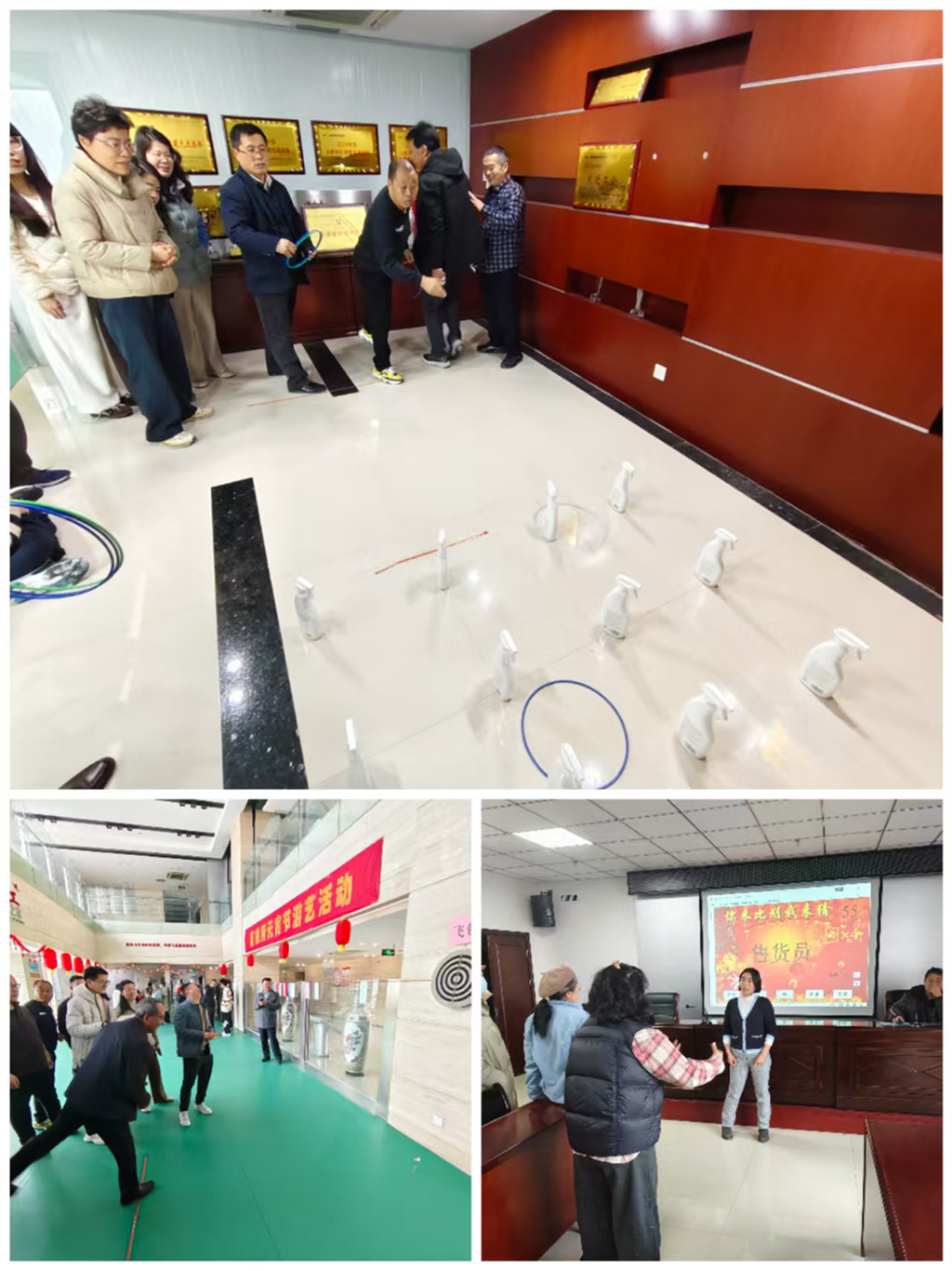 随后,游艺活动正式拉开帷幕,现场瞬间变成了欢乐的海洋。灯谜竞猜区人头攒动,红彤彤的灯笼下悬挂着数百条灯谜。职工们驻足思索、互相探讨,猜中谜底的职工喜滋滋地领取奖票,成就感满满。另一边更是热闹非凡,各项活动轮番上演,精彩纷呈。“挤凳子” 游戏中,参与者随着敲锣声灵活移动,锣声骤停时的快速反应引得现场笑声不断;“你来比划我来猜” 环节,搭档们心有灵犀,生动的肢体语言与搞笑的猜答让现场掌声雷动;“飞镖投掷” 区里,职工们屏气凝神、精准发力,比拼着专注力与技巧;“套圈” 场地前,大家瞄准心仪奖品,挥手投掷,期待着幸运降临;“盲人敲锣” 项目中,蒙眼的职工在同伴的提示下摸索前进,一次次擦肩而过的遗憾与成功敲锣的欢呼,将活动氛围推向一个又一个高潮。