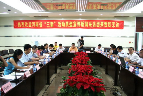 8月10日,省“新解放、新跨越、新崛起”大讨论活动典型宣传新闻采访团到我院进行专题采访。河南电视台卫星频道、都市频道、民生频道、《河南日报》、《大河报》、《河南商报》、《东方今报》、《经济视点报》、河南广播电台等10余家新闻单位参加了采访活动。