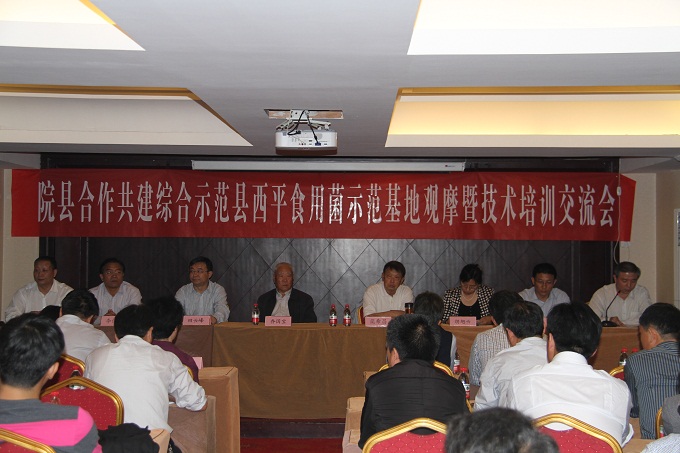 5月3日,我院在西平综合示范县举行“食用菌生产与加工技术示范基地”现场观摩与技术培训会。我院原副院长、老年科协会长蔺希昌,副会长乔国宝出席会议,省农业厅科教处、经作站,省食用菌协会,我院推广处、资环所和加工所,驻马店市农业局、农科院的负责同志和专家,西平县政府领导和有关部门、乡镇负责人,来自安阳、新乡、三门峡、商丘、周口和驻马店等6个市11个县(市)农业部门、农民专业合作社和食用菌生产加工企业的代表等共60余人参加了实地观摩与技术培训活动。会议由我院挂职干部、西平县科技副县长张磊主持。