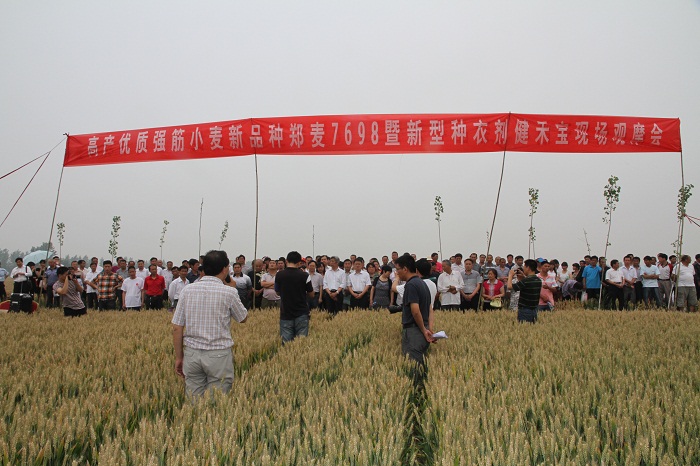 许为钢研究员分析了我国优质小麦生产和产业化的现状,预测了我国优质小麦生产发展的前景,介绍了郑麦7698和健禾宝在全省的示范推广情况。小麦研究所成果转化与应用研究室副主任张建周、季书琴研究员、化控研究室主任邵运辉等3位专家分别就郑麦7698的特征特性,健禾宝在防治地下害虫、全蚀病等多种病害和蚜虫的突出效果以及植物生长调节剂麦健的示范推广情况进行了介绍。西平县植保站杨新志站长介绍了郑麦7698和健禾宝在西平县的表现和示范推广情况,并给予充分肯定。据杨新志站长介绍,郑麦7698兼具高产、优质强筋、抗病、抗逆等优良特性,在西平县种植面积迅速扩大,目前已达到10多万亩,并且具备很大的生产应用潜力,预计将会为提升西平县小麦生产的进一步发展发挥重要的推动作用。