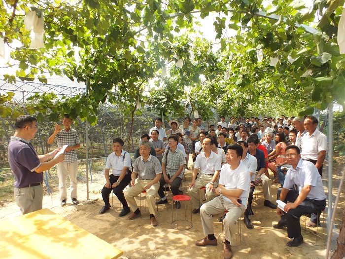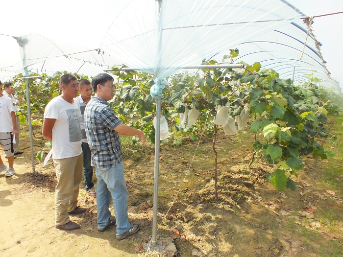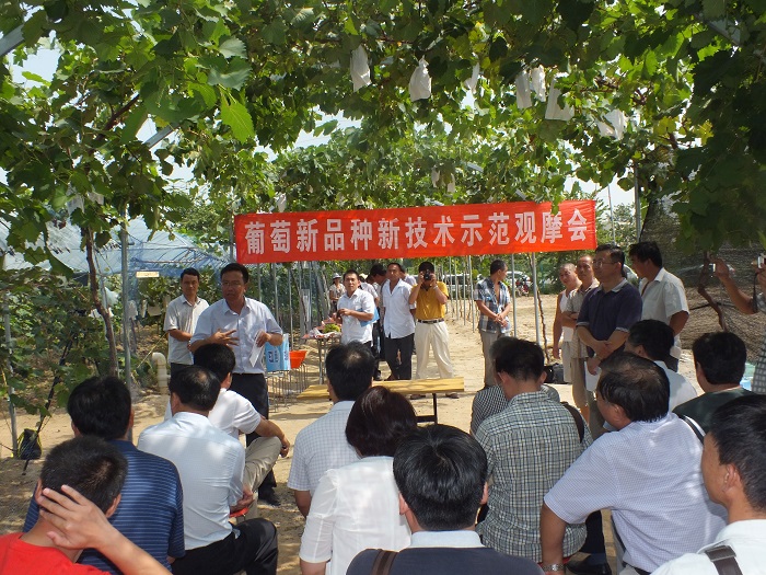 2012年起,由我院园艺所王鹏研究员带领的科研团队在河南现代农业研发基地新建了葡萄核心示范园,占地52亩,引进葡萄新优品种56个,示范避雨栽培、温棚栽培、露地栽培等3种栽培方式和单臂篱架、高宽垂架式、双十字V形架等3种栽培架式;示范新技术包括避雨栽培技术试验与应用、温棚葡萄促早栽培、葡萄花果管理技术试验与应用、肥水一体化、主要病虫害监测与综合防控等。如今,整个核心示范园设施齐备、管理规范、果实累累,已成为我省各地葡萄种植户观摩和学习葡萄新品种新技术科学种植的高标准示范样板,将为我省葡萄产业的健康发展提供有力的技术支撑。