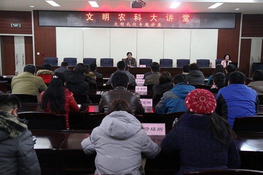 为推动我院精神文明建设,进一步提升干部职工文明素质,使干部职工全面、系统地掌握文明礼仪知识,在公务活动和日常工作生活中规范践行文明礼仪,展现良好形象,2月20日,我院2014年第一期“文明农科大讲堂”在院多功能厅举行。本次活动特邀河南农业大学党委宣传部副部长、硕士研究生导师陈娱教授专题讲授文明礼仪知识。讲座由院直属单位党委专职副书记白乐高主持,院直各单位办公室主任、科室主任、职工代表80余人参加了学习。
