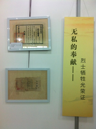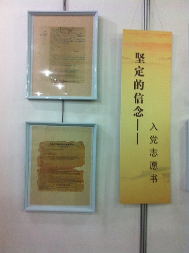该展览由理想的追求、坚定的信念、无私的奉献、群众的力量4个部分组成,共展出了革命战争年代的入党志愿书200多份、烈士光荣证300多个以及图书、画刊、教材等相关革命史料和部分实物;时间跨度从红军时期一直到解放战争、抗美援朝时期,全景式展现了革命战争年代全国范围内的红色历史资料。