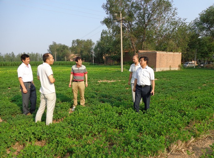 汤丰收研究员在实地查看了石婆固乡东史庄村、马庄乡姬庄村的百亩、千亩、万亩花生高产示范方的生长情况后,针对目前降雨稀少和花生生长发育特点,提出了 “抗旱浇水增饱果,及时防病保顶叶”的综合管理措施。他说,当前干旱田块应及时浇水,促进荚果发育,提高饱果率;对叶斑病、网斑病发生的田块,应及时喷施百菌清、多菌灵等杀菌剂加以控制,防止因病害而造成生长后期早衰,为秋季获得高产打好基础。