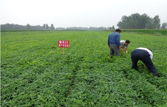 开封市农林科学院谷建中研究员、河南农业大学马新明教授和河南省农业厅任春玲研究员、时小红研究员、河南省驻马店市农科院王晓林研究员等专家组成员在实地察看了高产示范田的生长情况后,进行了实地测产,麦后直播花生品种为豫花22号、种植密度26611株/亩,平均亩产427.2kg;麦垄套种花生品种为豫花9719、种植密度16247株/亩,平均亩产413.8kg。专家组一致认为,在今年大旱之年,花生单产能突破400公斤实属不易,这与新品种、新技术的应用密不可分;同时认为麦后直播种植只要选用品种得当、适当增加密度和采用以促为主的管理措施,完全可以替代麦垄套种的花生种植方式,大幅提高花生生产的机械化程度和劳动效率,降低劳动强度,适应农民大量进城务工新形势下花生生产的可持续发展。
