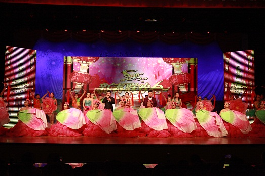 新春的歌,新春的舞,联欢会在舞蹈《新春序曲》的喜庆表演中拉开了序幕,整场演出现场亮点纷呈,高潮迭起。欢快热情的劲舞《小苹果》、《西班牙之火》,活泼幽默的相声《夫妻战争》、小品《上课请听话》,励志向上的歌曲《奔跑》、《火了火了》等一个个精彩的节目将现场喜庆氛围推向了顶点。