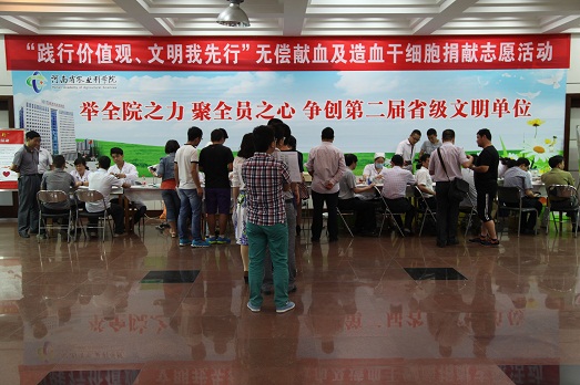 为深入培育和践行社会主义核心价值观,扎实推进全院精神文明建设,大力倡导“奉献、友爱、互助、进步”的志愿者精神,响应省委省直工委和省红十字会的倡议,5月20日上午,我院在综合楼多功能厅组织开展了“践行价值观、文明我先行”无偿献血及造血干细胞捐献志愿活动。 无偿献血及造血干细胞捐献是利国利民的公益性事业,是一个单位乃至一座城市文明进步的标志,是珍惜生命、善待生命的具体体现。在献血现场,院直各单位由主要领导带队,参加献血的志愿者有条不紊地填表、体检、检测、献血。院直属单位党委书记、副院长邹庆鹏率先垂范,亲临活动现场慰问志愿者并带头献血400cc;高方、马元炳、王定林、侯大虎、郑宝叶、宝德俊、徐小双、张为、郑国清、周玲、万景瑞、李保全、曾凯、张克武、赵志芳、张显华、金荣生、焦宏廷、田洪升、罗鹏等20多位处级领导干部积极参加了无偿献血活动。在参加献血的同志当中,有刚刚学校毕业进入工作岗位的年轻同志,也有年逾五旬、德高望重的研究员、老职工。有一些报名的同志由于身体的原因,没有通过血液检测,也表露了失望的心情。他们奉献爱心,奉献热血的真诚与无私,既是个人人格、人性的精彩展现,也是我们的农科精神的良好体现,更是我院精神文明建设结出的丰硕之果。让我们向他们致敬! 这次无偿献血志愿活动是我院“践行价值观、文明我先行”系列活动的一部分,共有149名职工报名,104名职工成功献血3万余毫升,10名职工参加了造血干细胞留样并签订了志愿捐献者同意书。活动的成功开展展现了我院干部职工的奉献精神和社会责任感,激励和凝聚了职工干事创业的热情,将有力地推动我院各项事业的又好又快发展。