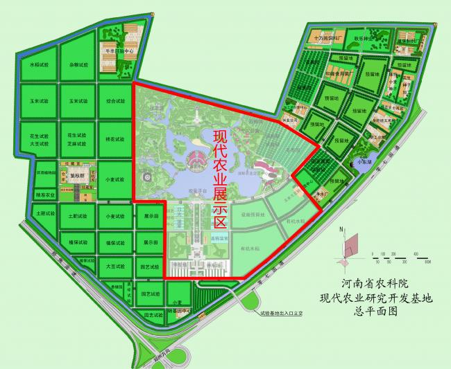 现代农业展示区位于基地的中心区,占地135.87公顷。分为交通集散区、门景区、设施农业展示区、农业观光区和综合办公区五大功能版块。展示区以中心龙湖为核心,湖与周边环渠相连,形成流动循环水系,结合栽植水生植物,达到人与自然和谐共存。主要功能包括无公害农产品规范化生产,设施农业(果树、蔬菜、花卉、食用菌),节水农业,生态农业,旱地农业的示范和国内外名特优新农作物品种及珍稀植物资源的鉴定、驯化、展示等;为全省基层农业科技人员提供现代农业技术培训,农业高新技术成果展示,农业发展史,农业科技发展史,农业科技知识普及及珍稀优质农产品展览等。