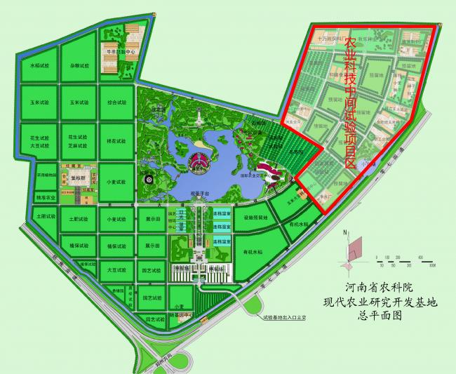 农业科技中间试验项目区位于基地的东北角,占地91.77公顷,分为研发、加工、生产三个区域。主要功能包括种子加工包装,农副产品加工、保鲜,工厂化育苗,新型农药、化肥、饲料、植物生长调节剂及生物制剂,良种牛羊胚胎生物技术等中试与示范。该区景观突出科技,结合现代科技小品、雕塑,与自然景观、田园景观相融合,为工作人员提供一个舒适的工作环境,在办公和生活之中体验到科技的神奇和田园风光的旖旎。