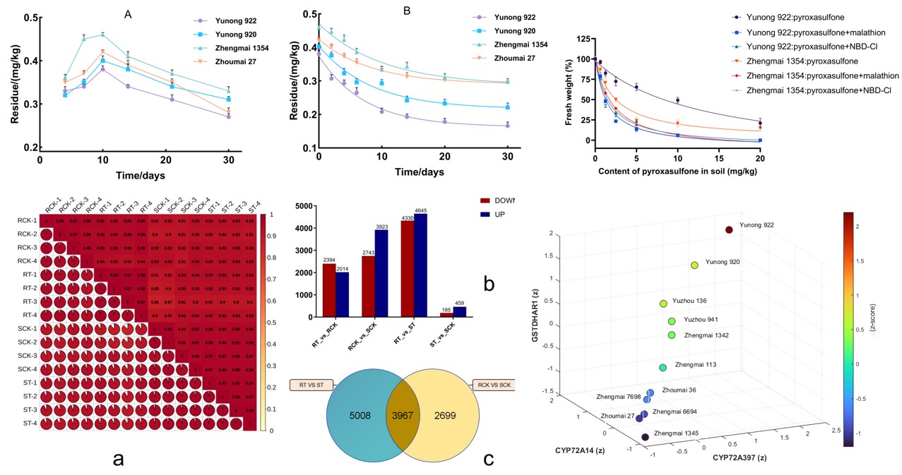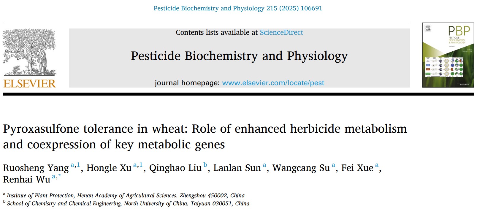 近日,我院植保所农药应用研究团队在农药学研究领域国际知名期刊Pesticide Biochemistry and Physiology(《农药生物化学与生理学》(中科院一区Top期刊),在线发表了题为 “Pyroxasulfone tolerance in wheat: role of enhanced herbicide metabolism and coexpression of key metabolic genes”的研究论文,该研究揭示了小麦对砜吡草唑的耐药性存在一种全新的P450酶依赖性潜在途径,明确了小麦对砜吡草唑的耐药性是由P450和GST联合介导的,并鉴定验证了抗性相关基因,为开发耐药性转基因作物研究提供了理论依据。