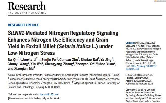 近日,我院粮作所李君霞团队在谷子耐低氮基因挖掘与分子机制研究方面取得重要进展,相关研究成果“SiLNR1-Mediated Nitrogen Regulatory Signaling Enhances Nitrogen Use Efficiency and Grain Yield in Foxtail Millet (Setaria italica L.) under Low-Nitrogen Stress”发表于生命科学领域知名期刊《Research》(中科院1区top期刊,IF=10.9)。该研究通过正向遗传学成功克隆出谷子耐低氮基因SiLNR1,系统阐明了其正向调控谷子氮利用效率和生长发育从而增强谷子耐低氮胁迫的分子机制,为耐低氮作物分子育种提供了新的理论依据和重要的基因资源。