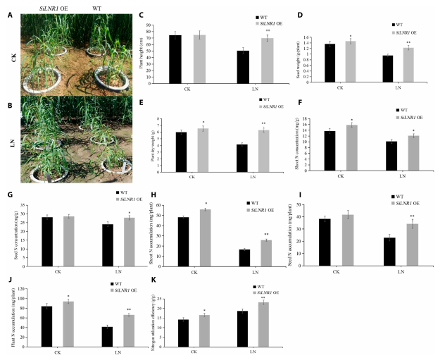 谷子主产区贫瘠土地日益扩大和氮肥利用率低严重制约谷子产能提升,而过量施用氮肥导致环境污染与资源浪费,谷子作为C4模式作物,其耐低氮基因的发掘与作用机制亟待探究。本研究利用QTL定位、基因组和转录组分析,从谷子RIL群体中鉴定出低氮胁迫诱导表达的氮代谢调控基因SiLNR1,并证实该基因正向调控谷子耐低氮性。互作实验揭示其与茉莉酸信号转录因子形成互作模块协同调控谷子耐低氮特性。该研究系统揭示谷子耐低氮胁迫响应新基因及其分子调控网络,为分子育种提供靶标,驱动耐瘠种质创新,助力实现“藏粮于技”的农业可持续发展目标。
