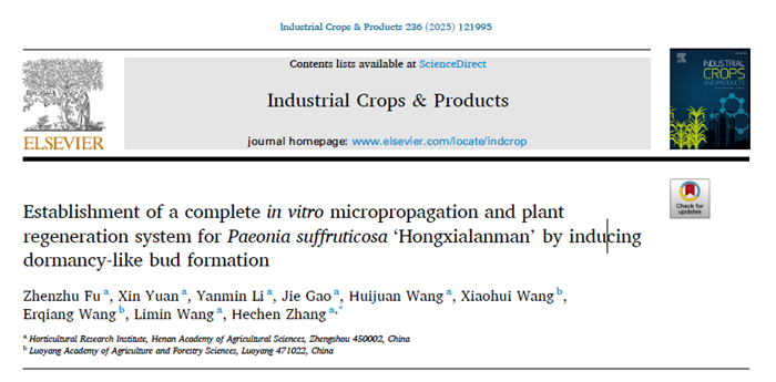 近日,我所在牡丹组织培养技术方面取得重要进展,相关研究成果“Establishment of a complete in vitro micropropagation and plant regeneration system for Paeonia suffruticosa ‘Hongxialanman’ by inducing dormancy-like bud formation” 发表于国际知名学术期刊《Industrial Crops And Products》(中科院1区,Top期刊,IF=6.2)。该成果成功建立了一套完整的牡丹组织培养技术体系,为解决牡丹繁殖难、育种效率低的产业瓶颈提供了关键技术支持。