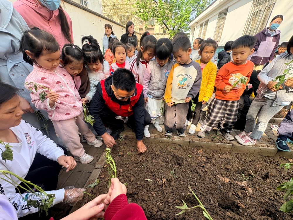 2026年4月9日上午9时,河南省农业科学院幼儿园大班一班、二班、三班小朋友在园内种植区开展红薯苗种植劳动实践活动。植物脱毒种苗快繁中心主任娄长城、何闪闪博士,办公室冯乃曦参加活动,现场指导幼儿动手实践。