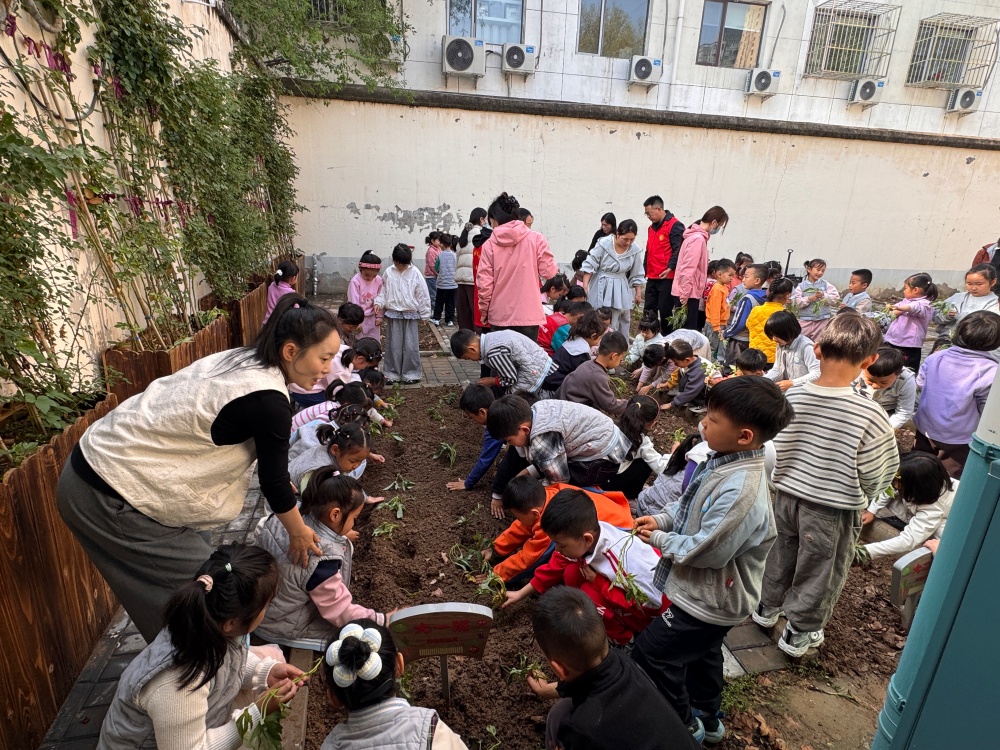 讲解过程中,孩子们专注聆听。当被问及“学会了没有”时,大家齐声回答:“学会了。”现场工作人员为每位小朋友分发一株薯苗。在专家和教师指导下,孩子们依次完成刨坑、放苗、培土等操作,将薯苗栽入本班种植区域。