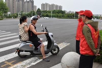 活动中,志愿者们身穿红色马甲,手拿小红旗,耐心细致地劝导行人闯红灯、乱穿马路、与机动车抢行、未佩戴安全头盔骑行等不文明、不规范行为,讲述遵守交规,安全文明出行的重要性。