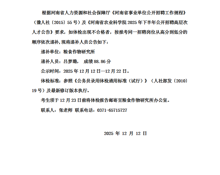 河南省农业科学院2025年 下半年公开招聘高层次人才面试成绩与体检递补公告