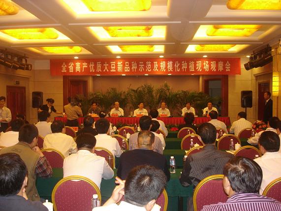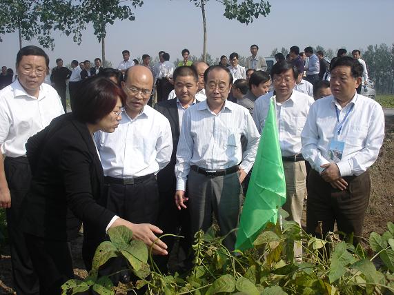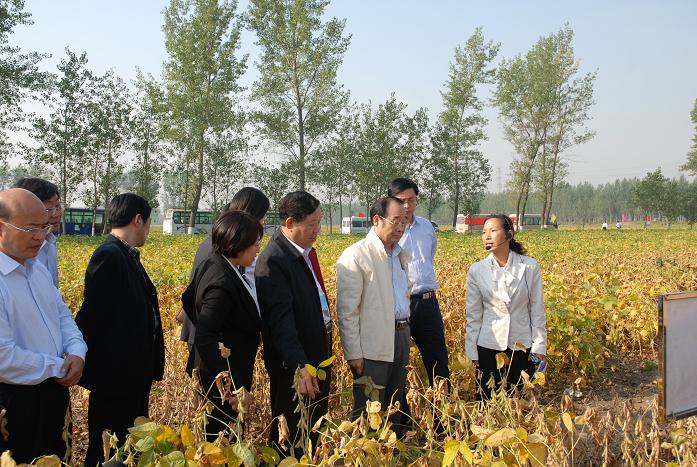 永城市是我省及黄淮海地区最大的大豆生产基地,常年种植面积在65万亩。近年来,在我院专家的指导帮助下,大豆面积逐年增加,2011年达85万亩。与会人员先后观摩了位于永城市城郊乡张庄的大豆新品种试验展示田和位于永城市黄口乡平楼村和田庄村的万亩夏大豆高产示范区。商丘市委常委、永城市委书记吴孟铎首先致辞,我院经作所大豆专家、永城市副市长梁惠珍研究员汇报了永城市大豆高产创建和新品种示范推广情况,何东成和马万杰等领导对永城市大豆高产创建所取得成效和经验给予高度评价,并对永城市依靠科技实现“三化”协调发展提出了宝贵建议。