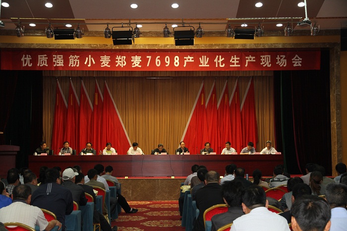 5月27日,我院在濮阳召开“高产优质强筋小麦新品种郑麦7698产业化生产”现场观摩会,院党委书记房延修,副院长房卫平,省政府参事、省科技厅副巡视员王志和,濮阳市副市长邹东波等领导出席会议,省农业厅种植业处汤其林处长,濮阳国家粮食储备库刘继广主任,我院推广处、小麦所,濮阳市农业局、科技局、粮食局、农科院等单位负责同志和专家,来自濮阳、清丰、南乐、内黄、滑县和河北省磁县等11个县种子、供销等部门以及中粮集团、中储粮河南分公司、河南五星种业有限公司等20余家企业代表共260余人参加了现场观摩会。会议由濮阳市农科院院长李政道主持。