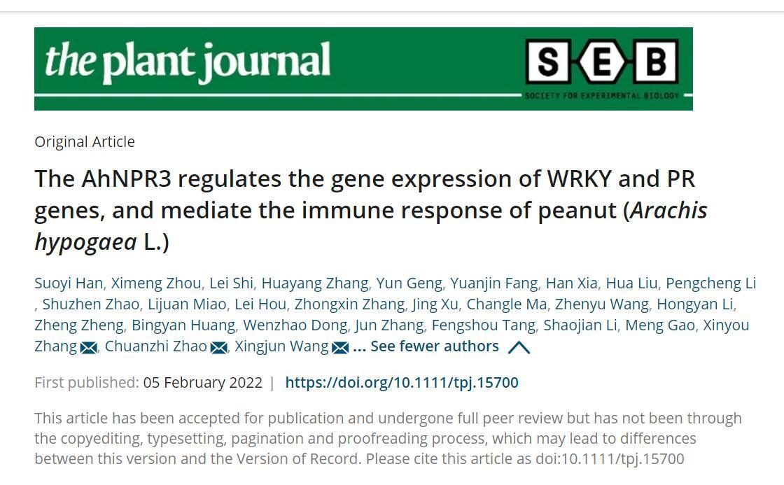 2022年2月5日,国际权威学术期刊The Plant Journal (植物科学1区Top,5年平均影响因子7.66) 在线发表了我院张新友院士领衔的花生团队与山东省农业科学院农作物种质资源研究所王兴军团队合作的最新相关研究成果,题为“The AhNPR3 regulates the gene expression of WRKY and PR genes, and mediate the immune response of peanut (Arachis hypogaea L.)”的研究论文。该研究定位并克隆了花生抗病相关的重要基因AhNPR3,并揭示了该基因在调控花生WRKY和病程相关蛋白基因中的作用,该研究得到国家自然科学基金项目(31871663)等项目资助。