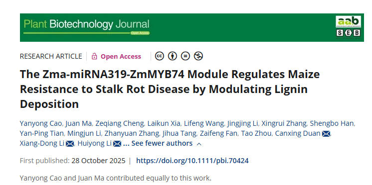近日,我院曹言勇-李会勇团队联合中国农业科学院作物科学研究所段灿星团队、山东农业大学李向东团队在Plant Biotechnology Journal(中科院一区Top期刊,5年平均影响因子12.5)在线发表题为“The zma-miRNA319-ZmMYB74 module regulates maize resistance to stalk rot disease by modulating lignin deposition”的研究论文,该研究通过多维组学整合分析,成功鉴定出zma-miR319-ZmMYB74这一关键调控模块,系统阐明了其通过负向调控木质素合成关键基因ZmCAD从而影响玉米茎腐病抗性的分子机制,为玉米抗病分子育种提供了新的理论依据和宝贵的基因资源。