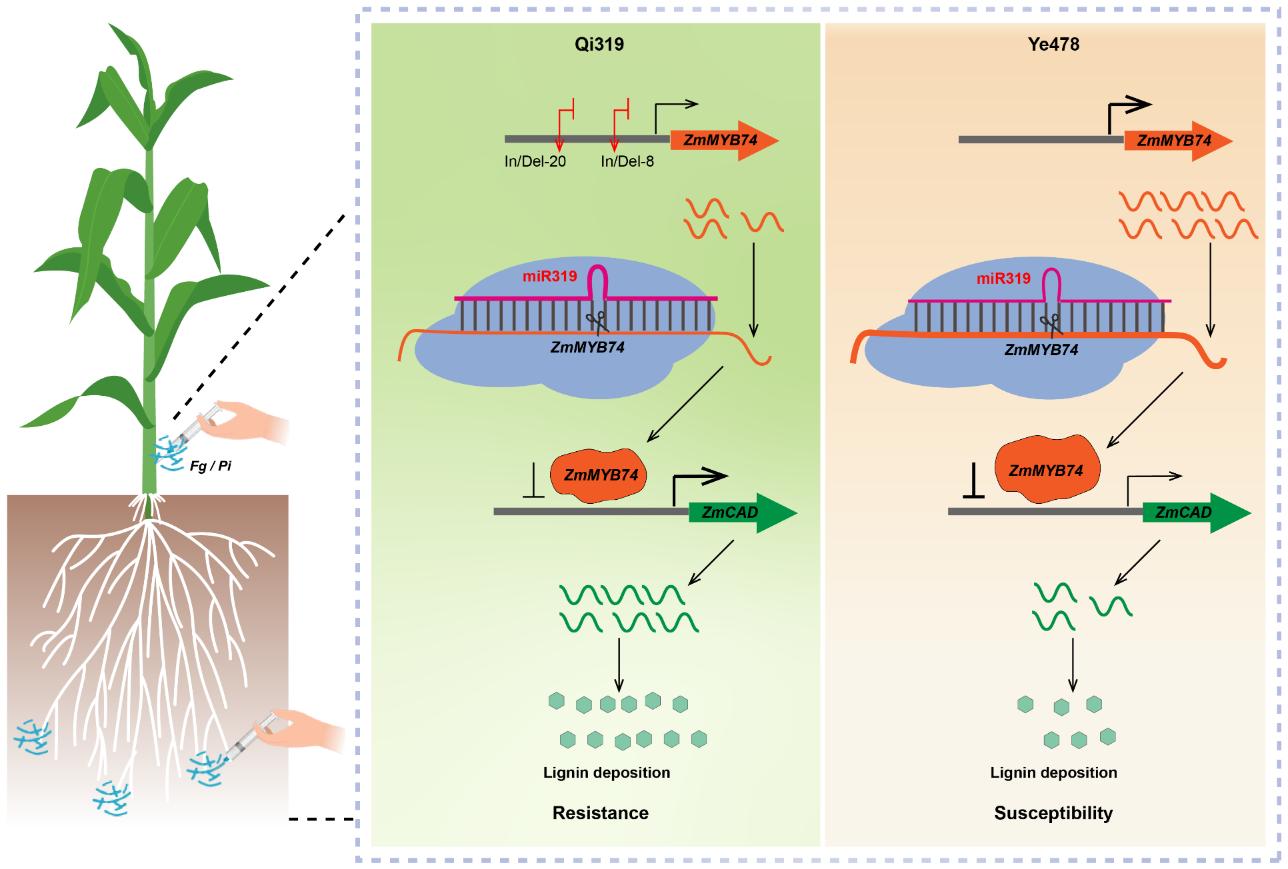 研究团队成功构建了zma-miR319-ZmMYB74模块协同调控玉米抗茎腐病的分子机制模型:在茎腐病菌侵染后,玉米通过上调zma-miR319的表达来抑制其靶基因ZmMYB74的转录。ZmMYB74表达的减弱,解除了其对木质素合成关键基因ZmCAD的转录抑制,从而促进木质素在细胞壁中沉积,增强植株的物理防御能力,最终提高对茎腐病的抗性。总之,本研究阐明了新型抗病基因ZmMYB74在调控玉米茎腐病抗性中的关键作用,为精细设计玉米茎腐病(穗腐病)等重要病害抗病育种提供了具有重要价值的定向设计靶点和种质材料;在当前因气候变暖趋势不可逆导致的玉米病害频发的大背景下具有重要意义。