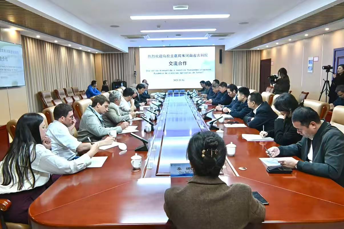 河南省农业科学院副院长韩启忠发表致辞,向远道而来的乌拉圭友人表示热烈欢迎,同时向为推动此次合作落地付出努力的各方团队致以诚挚感谢。韩启忠介绍,河南省农业科学院自1909年创立以来,始终坚守“科技兴农”的使命,如今已发展为拥有24家研究机构的区域农业研究创新中心。其研究领域覆盖小麦、玉米等主要粮油作物,园艺、中药材等特色产业,以及畜禽疫病防控、农产品质量安全等多个方向,学科门类齐全,科研布局完善,并且有强大的人才梯队为科研创新提供坚实支撑。