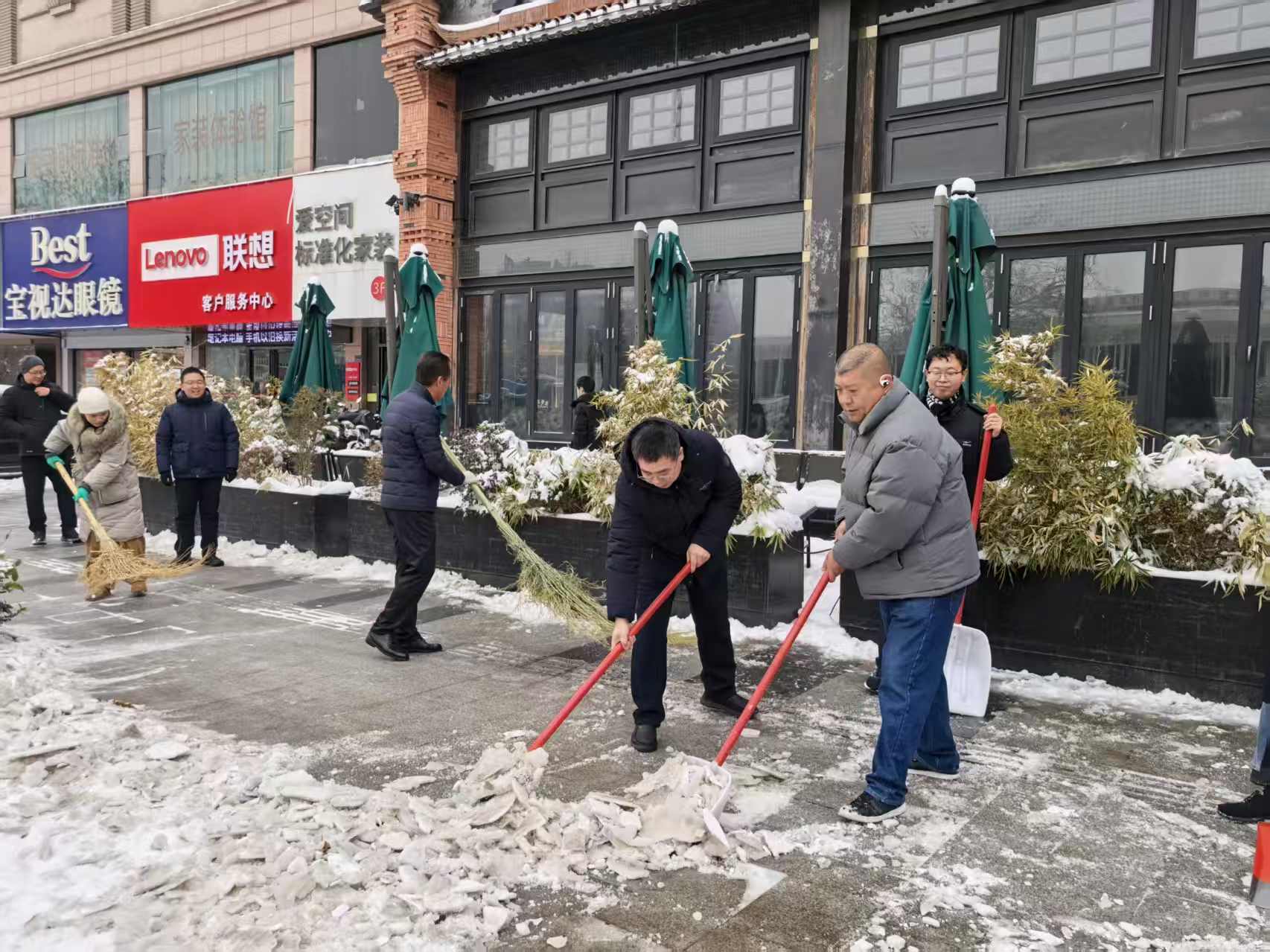 上午9时,经作所职工们带着铁锹、雪铲、扫帚等工具迅速集结,以饱满的热情投入到除雪行动中。两位所长率先拿起铁锹、雪铲,以身作则投入到扫雪工作中,带头清理路面顽固积雪和薄冰。在领导的示范引领下,职工们分工协作,大家手持铁锹、扫帚等工具,有的负责铲除路面压实的冰雪,有的负责将积雪清扫至路边,有的负责清理沿街商铺门前的残留积雪。尽管天气寒冷,职工们的额头上却都渗出了汗珠,热情与干劲让整个扫雪现场暖意融融。