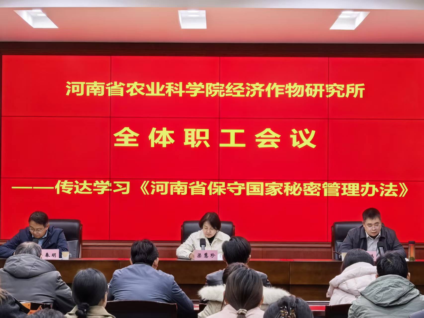 3月9日,河南省农业科学院经济作物研究所召开全体职工会议,专题传达学习《河南省保守国家秘密管理办法》(以下简称《办法》),部署全所保密工作。副所长王会伟传达文件精神,所长梁慧珍主持会议并讲话,全所干部职工参会。