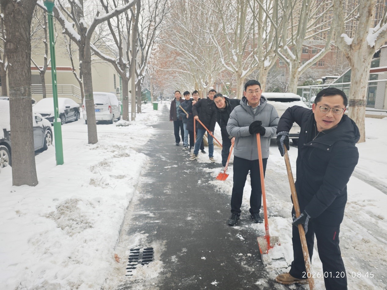 在所领导指示和办公室具体组织下,本单位在职职工、在站博士后、在读研究生等二十余人积极响应号召,不畏严寒,齐心协力,手持清扫工具,重点对办公区域楼下及所属卫生责任区内的主干道、人行道路面积雪积冰进行了全面清理。经过一个多小时的辛勤劳动,相关区域路面冰雪基本清除,有效恢复了道路原貌,保障了人员与车辆的通行安全。