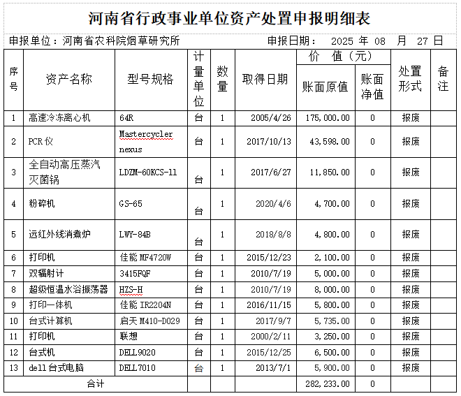 根据河南省行政事业单位国有资产处置流程,我单位拟报废固定资产13项,资产名称、资产原值等详见表格。我单位采取公开竞价方式进行处置,欢迎符合条件的公司和个人参加。